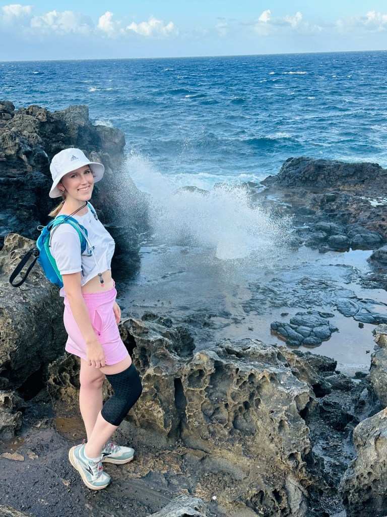 Later, we met back up with Caroline and Amy and drove out to hike the Nakalele Blowhole Trail. We were not prepared for how intense this trail would be! It was more of a scramble down lava rocks than an actual marked trail, but reaching the blowhole was totally worth it. The power of the water shooting up was mesmerizing, but we made sure to keep our distance—there’s a tragic story of someone getting too close and falling in back in the early 2000s, so we played it safe.