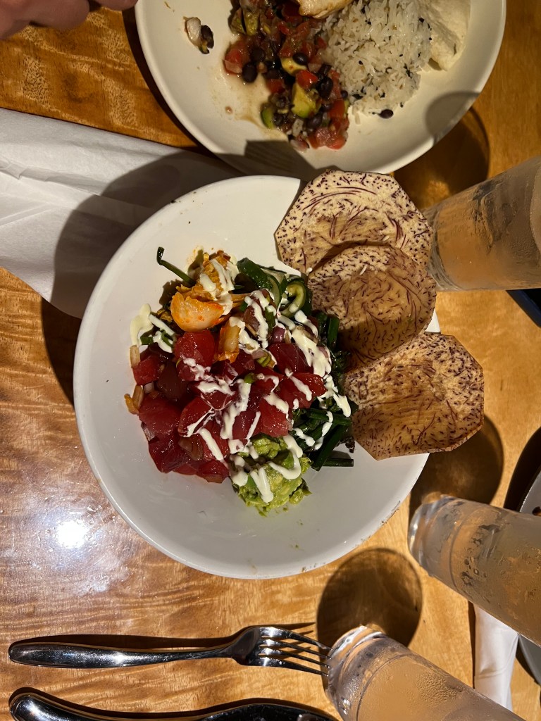 To wrap up the day, we returned to Whalers Village for dinner at Hula Grill. Jordan and I split the firecracker fish (spicy aioli, black bean avocado salsa, wrapped in local tortillas) and the ahi poke bowl (fresh ahi tuna, maui onions, chili flakes, ginger rice, avocado, pohole fern, cucumber, and hearts of palm). Everything was fresh and delicious. For dessert, we couldn’t resist the pono pie, made with local “ulu” breadfruit—so unique and the perfect way to end the meal.