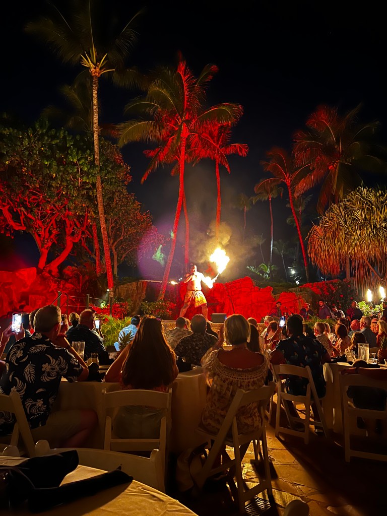 Later in the evening, we met up with Jordan’s family at the Westin Resort for a traditional luau. The food was served buffet style, and there were so many delicious options. We got to try poi, a Polynesian paste made from taro root, which is a major agricultural product on Maui. I’ll admit, it wasn’t my favorite, but I love trying local dishes whenever I can. The real highlight was the show—the dancers were incredible, and the stories they told through hula were mesmerizing. The ceremony leader explained how, before the ancient Polynesians had a written language, they passed down history and stories through dance, which made the performance even more meaningful.