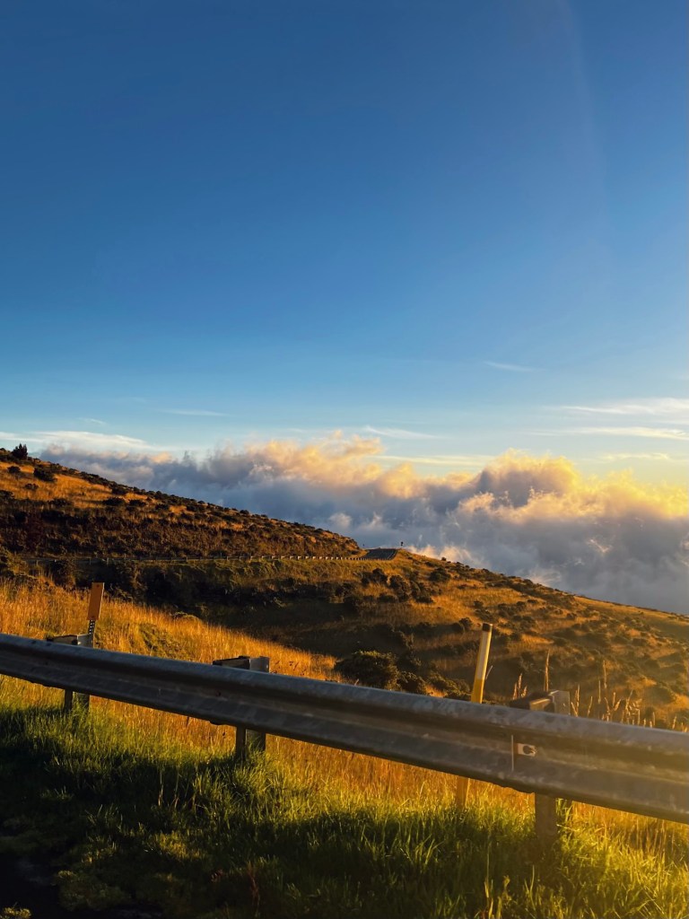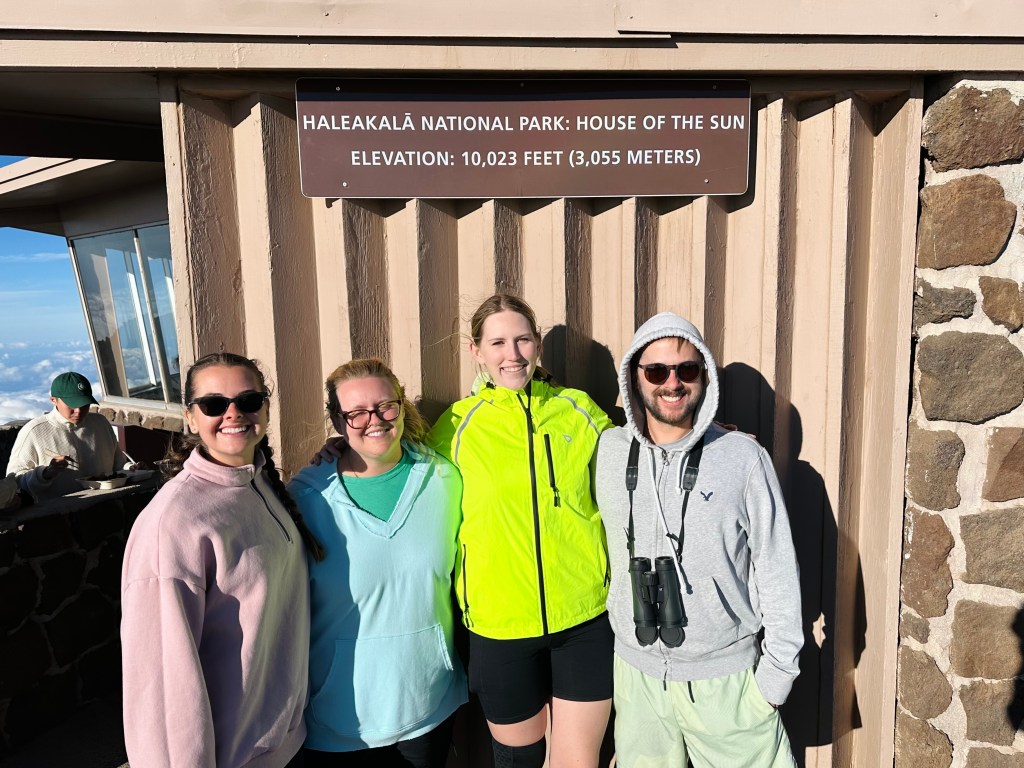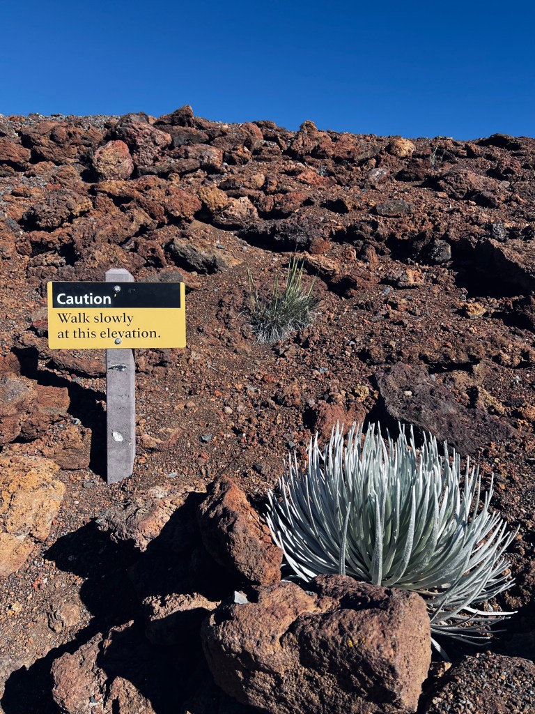 With my birding mission accomplished, we continued up the mountain. Even from the 6,000-foot mark, it took another 30 minutes to reach the summit. The drive was surreal—our ears were popping constantly, and I even felt pressure in my eyes! When we finally reached the top, it was 50 degrees and incredibly windy. Our self-guided app tour mentioned that temperatures drop below freezing at night, which is crazy to think about for Hawaii.
