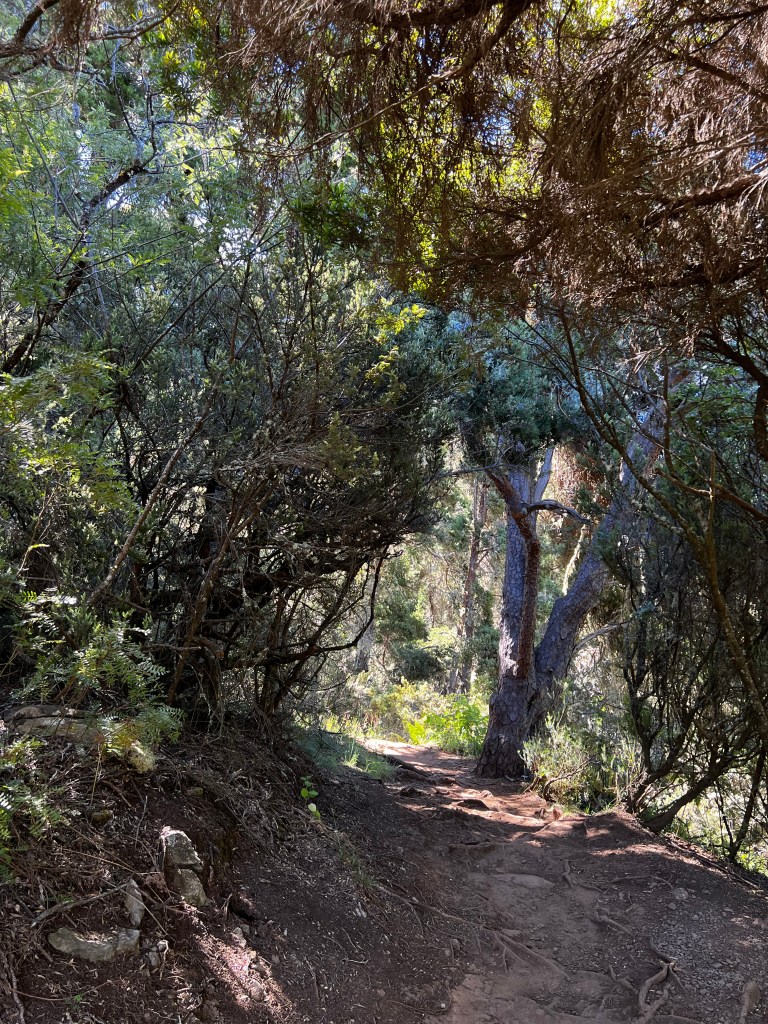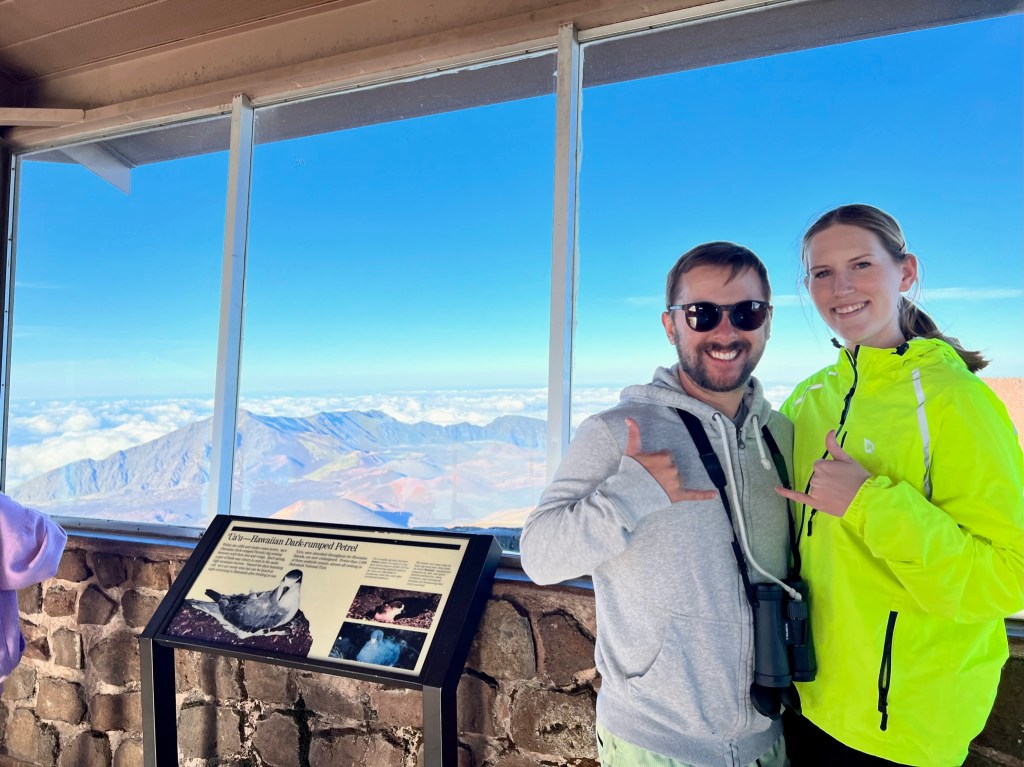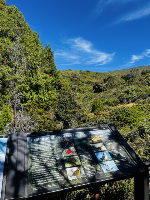 We couldn’t head straight for the summit, though, because I had a birding mission at the Hosmer Grove Trail, around the 6,000-foot elevation mark (the summit is at 10,000 feet). I was on the lookout for some of the endemic honeycreepers that call Haleakala home. There are only 17 species of honeycreepers left out of the original 40, mostly because they’re so vulnerable to avian malaria. Due to rising global temperatures, the birds have less habitat that is mosquito free. I told Jordan I wasn’t leaving until I saw at least one! On our first loop, we didn’t see any birds (though we could hear plenty), but on the second pass, we stopped at a lookout point. After a bit of scanning, I finally spotted an ‘apapane, a little red honeycreeper cleaning itself on a branch. A bit later, I saw an i‘iwi and an ‘amakihi—I was over the moon!