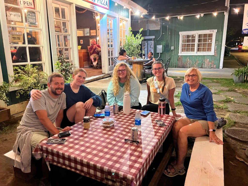 After our long day, finding dinner was a challenge. Most places on Maui close early, and Caroline and Amy must have looked up 10-15 restaurants, all of which were closed by 8 PM. Finally, they found Prison St. Pizza in Lahaina, which was open until 9 PM. The pizza was solid, but honestly, at that point, we were all just starving and happy to find food!