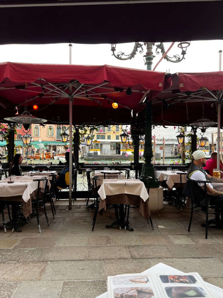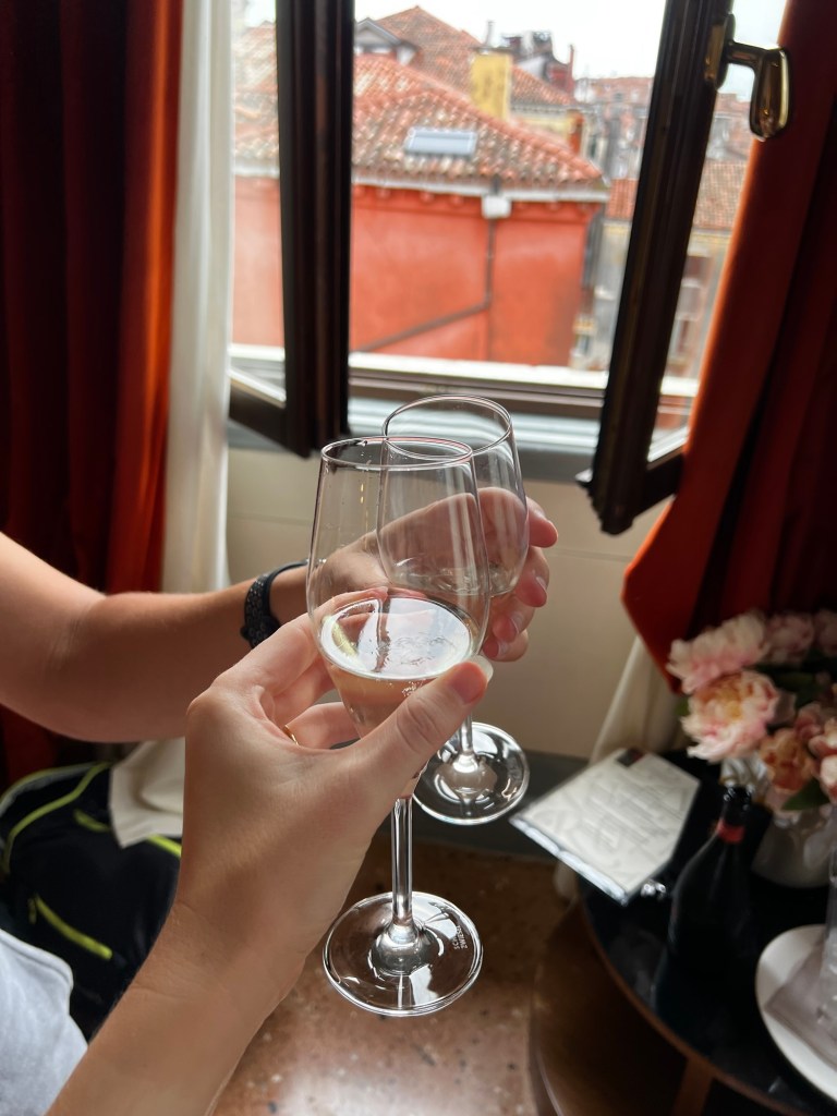 Our final stop was Caffè Saraceno, where we found the perfect spot with a view of the Grand Canal right next to the Rialto Bridge. We sipped on wine, people-watched, and enjoyed the peaceful atmosphere. It was the perfect way to wind down after a long day of travel. By then, the jet lag was kicking in hard, so we made our way back to the hotel (though it was only 6:30 pm!).
