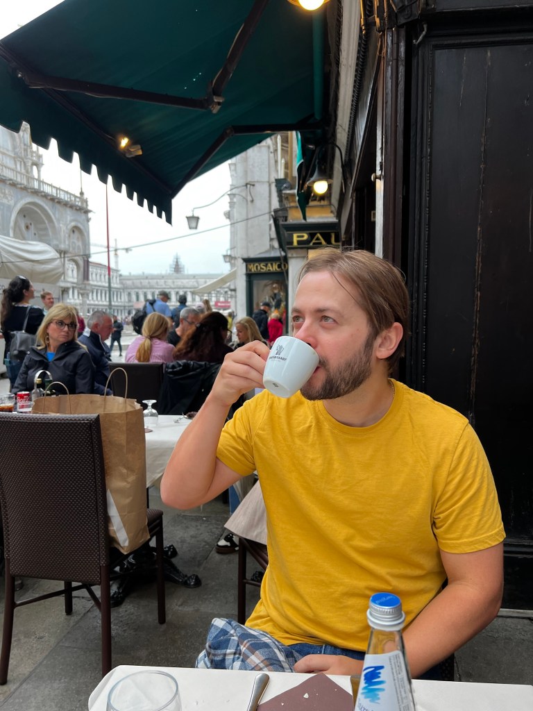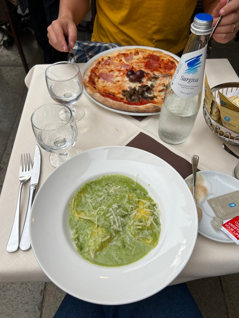 Of course, the first thing I wanted was a cappuccino and some pasta. So, we headed out to explore the winding streets in search of a place to eat. Venice is full of incredible restaurant options, and I’ll admit, it was a bit overwhelming. Eventually, we ended up in the San Marco district, where my hangry self led us to the first spot we saw—Ristorante Falciani, just steps away from the Basilica di San Marco. I ordered the ravioli with a cheese and asparagus filling, topped with pesto, while Jordan went for a four seasons pizza. It was definitely on the touristy side, but after 10 hours of traveling, everything hit the spot.