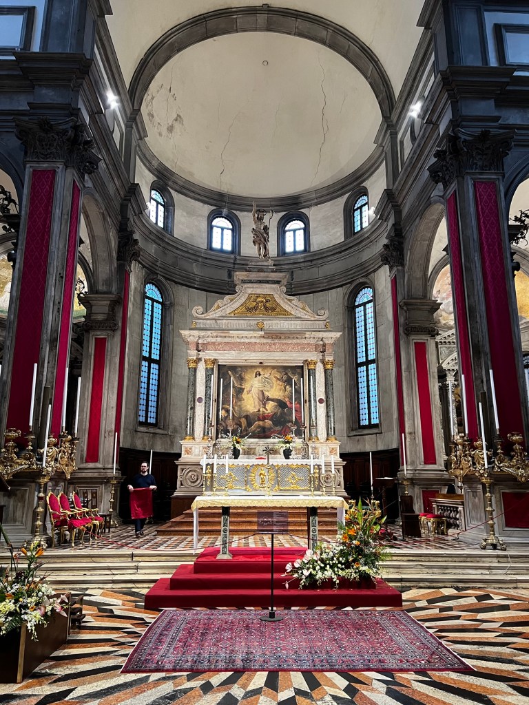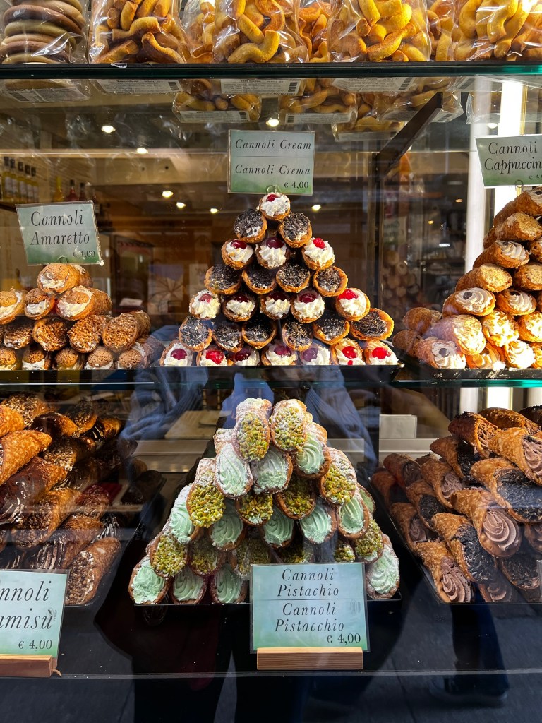 With no plans for the evening other than fighting off jet lag, we decided to stroll through the streets, window shopping and soaking in the Venetian charm. We stopped at the Church of San Salvador to admire its stunning architecture and, of course, were tempted by a window full of cannolis—so we gave in and had one!