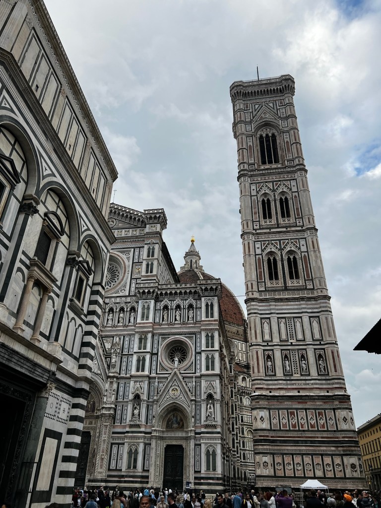 One of the highlights was Piazza del Duomo, home to the historic Santa Maria del Fiore, Brunelleschi’s Dome, and the Baptistery of San Giovanni. The dome is a marvel of engineering, built on an octagonal base—something never done before. Brunelleschi figured out how to complete it using a fishbone brick pattern for weight distribution and designing two domes, one inside the other with a hollow space between them. We’ll be walking up to the top of the dome tomorrow, so stay tuned!