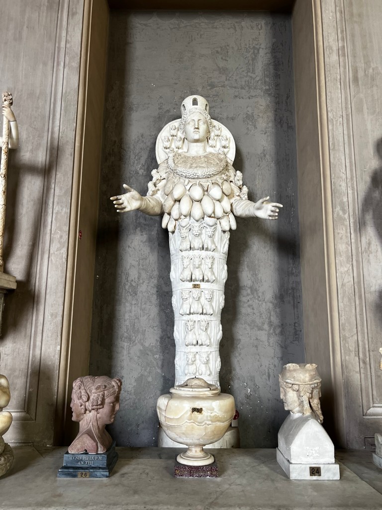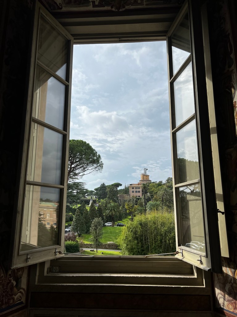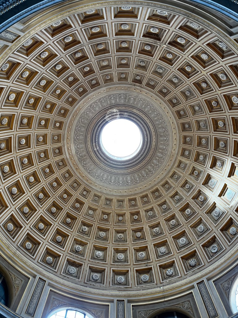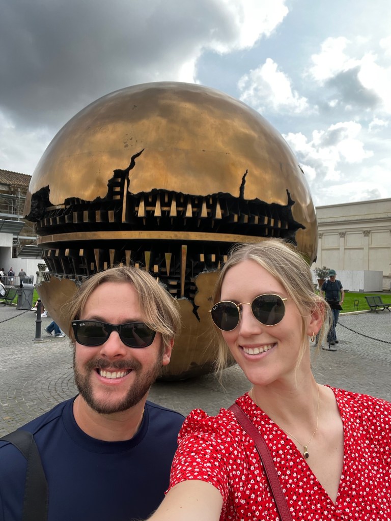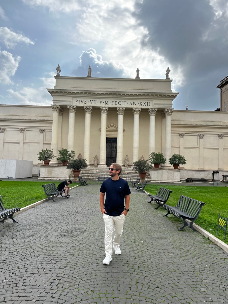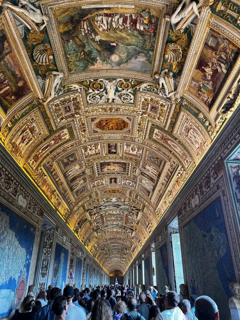 After breakfast, we made our way to the Vatican by bus, arriving for our 1 PM entrance time. The crowds were intense, but thankfully Jordan had booked our tickets in advance, so we avoided the massive line of people trying to get in without tickets. Once through security, the Vatican’s entrance felt like a busy train station, with kiosks and gift shops everywhere. We headed straight for the Pinecone Courtyard to start our tour.