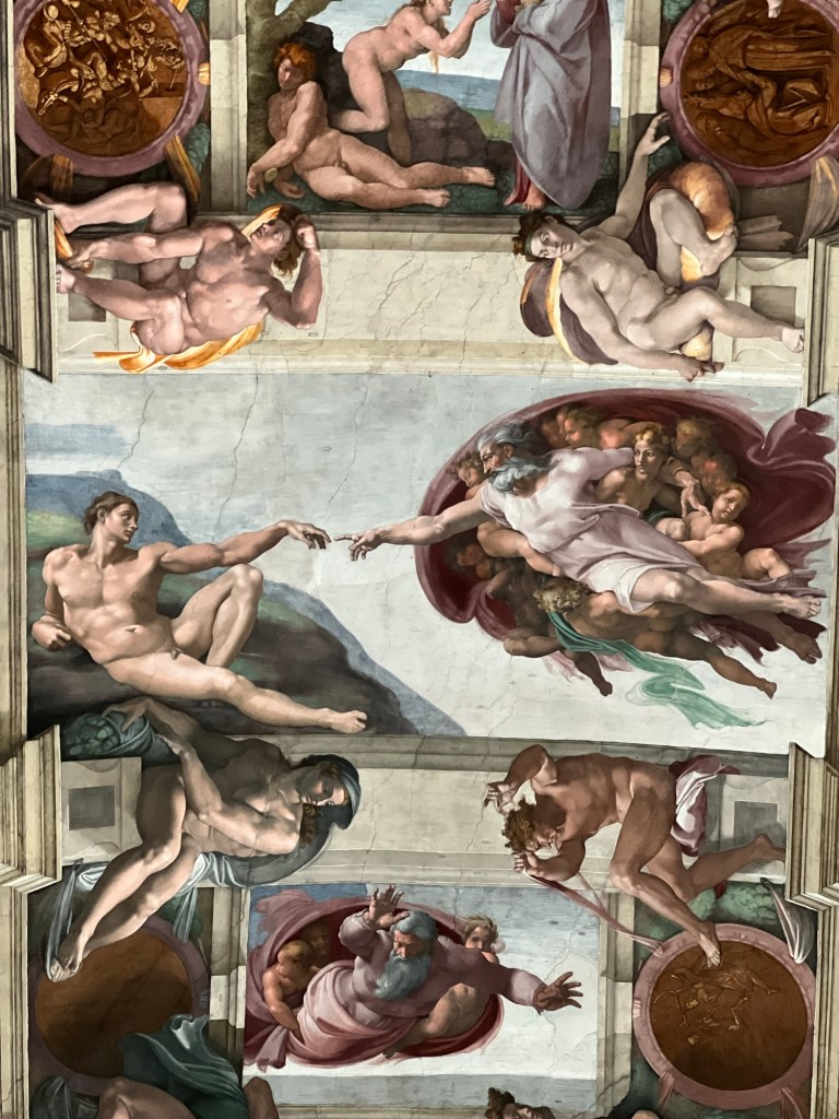 The highlight of the Vatican was, of course, the Sistine Chapel. We stood in awe for about 30 minutes while Rick Steves’ guide walked us through the history and meaning behind Michelangelo’s incredible frescoes. It was fascinating to learn that fresco painting had to be done quickly while the plaster was still wet, or they’d have to scrape it all off and start again. The restoration work they did a while back was remarkable too; they even left a small corner unrestored to show the difference in color. Apparently it took over 30 years to complete!