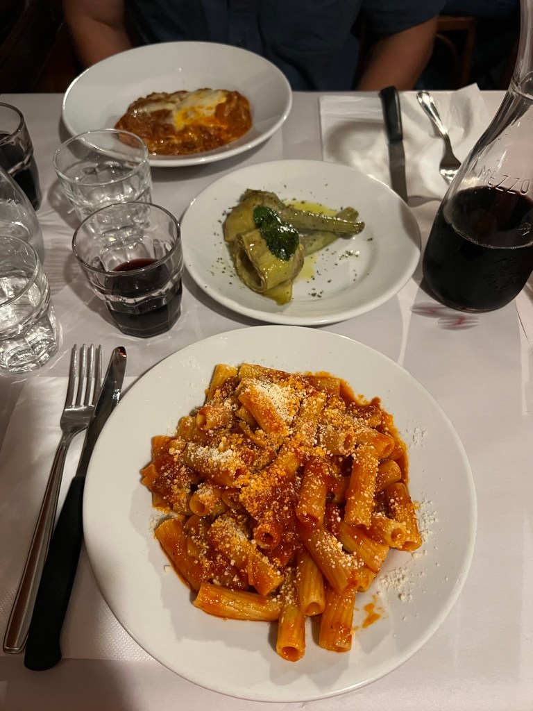 With our travel plans sorted, we went downstairs to ask the concierge for another dinner recommendation. He’s been so helpful and even gave us a list of dishes to order at his recomme Darion, Trattoria da Alfredo e Ada. The food was amazing! I had a traditional Roman dish, amatriciana, while Jordan ordered the lasagna. We also tried the artichokes, a Roman staple, and the vittella arrosto (veal scallopine in lemon sauce). It’s a small, family-run spot, so we shared a table with a lovely couple from Colorado, which made for a very pleasant evening.