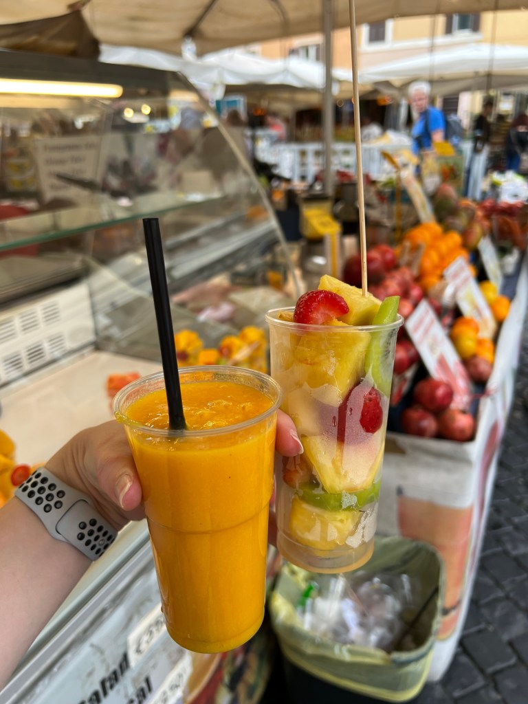 We also made a pit stop at the Campo de Fiori market, where we grabbed some refreshing mango and papaya juice and a tropical fruit salad. It was the perfect treat after a long day of biking.