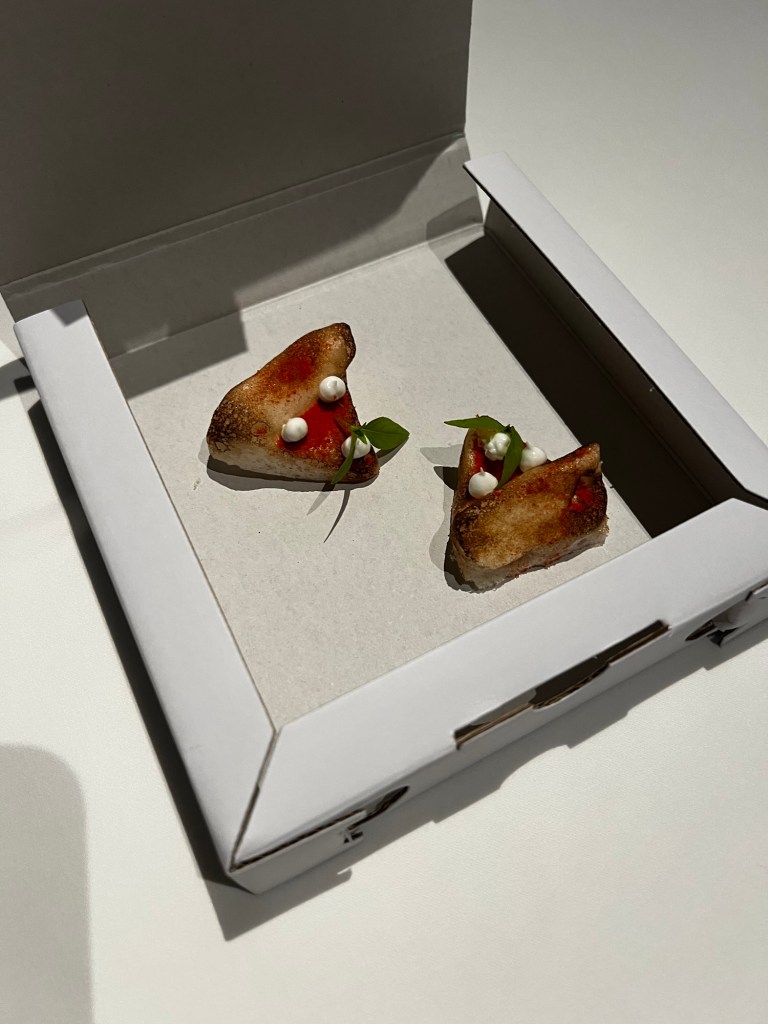 As the place started filling up, we relaxed, and the first round of treats arrived before we even chose our menu. The first was a mini Margherita pizza, and it was amazing—light, puffy, and packed with flavor. Next up was a tiny lasagna, also bursting with flavor despite its size. We were blown away by how good everything was.