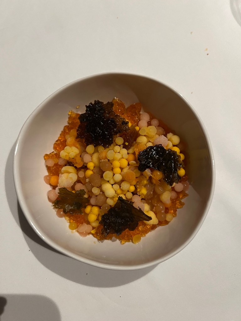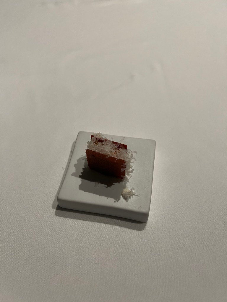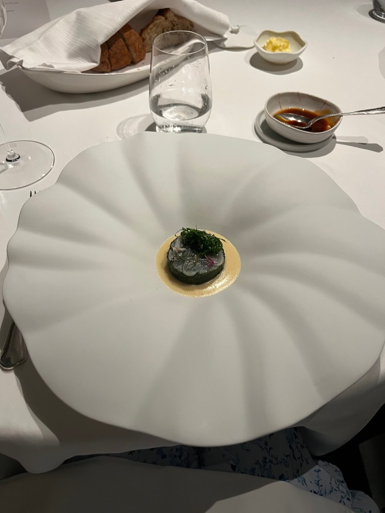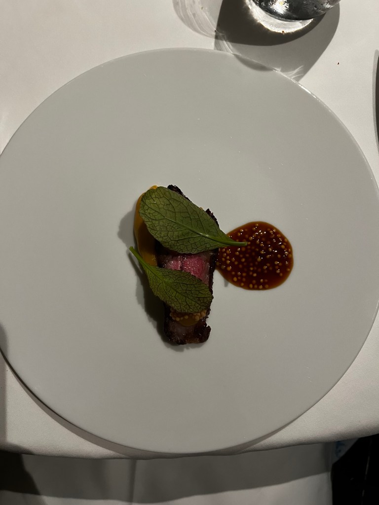 A few standout dishes: the bread and honey course (sadly, no photo) was incredible—fermented apple water bread with butter and marmalade. Jordan said it was the best bread he’d ever had! The mini ravioli was another favorite, and one dish came topped with Parmesan aged 10 years, which was next-level. I’m not sure I can go back to regular Parmesan after that.