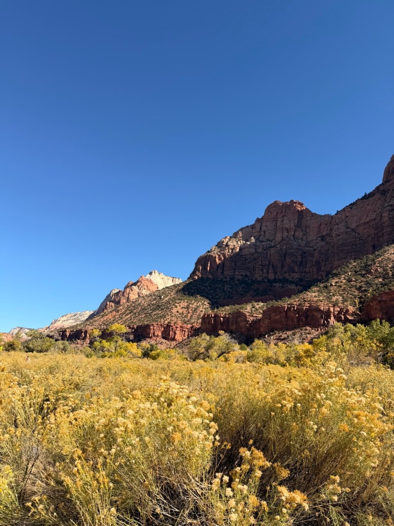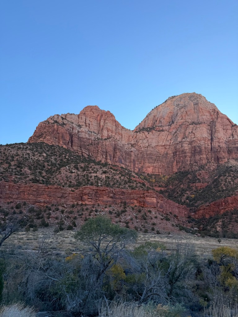 Because we had driven in at night, we woke up in the morning so excited to finally see the scenery. Our hotel overlooks the Watchman which is a very well-known mountain in Zion National Park, and wow, the view did not disappoint. You’re surrounded by the mountains in Springdale, so everywhere we looked there was another jaw-dropping view.