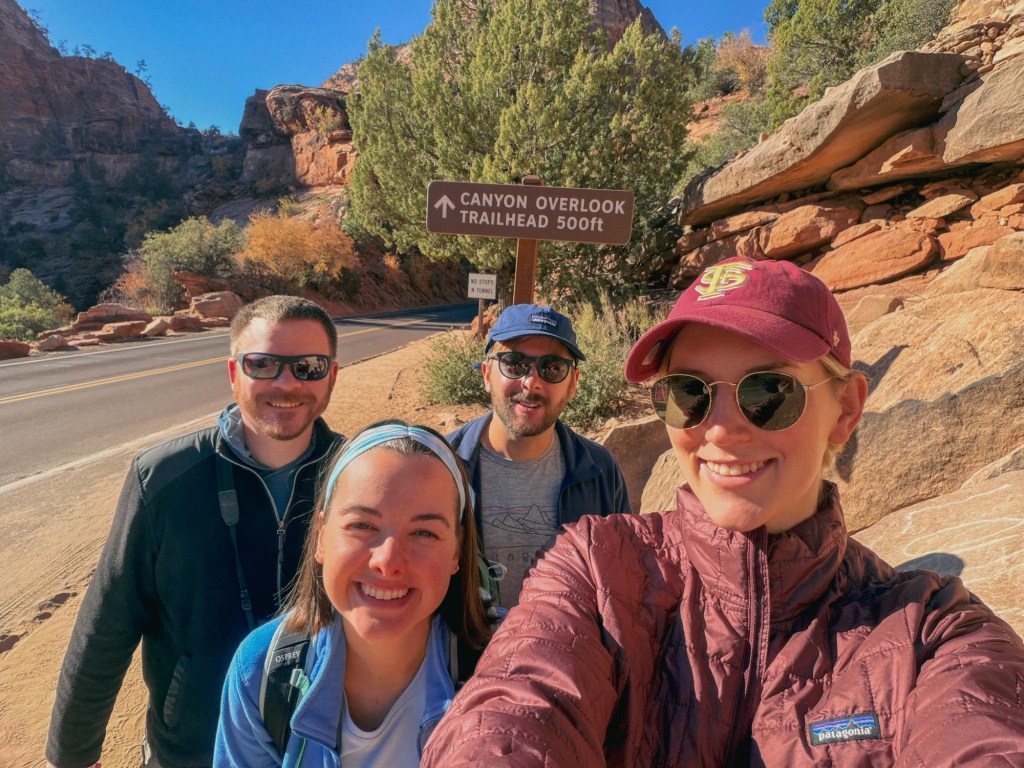Once we finished eating, we headed back to our rooms to get ready for the first outing of the trip: the Canyon Overlook Trail! This trail is a short one-mile hike to an amazing spot that overlooks Zion National Park. Jordan picked it as a warm-up, something to get us used to the steep drop-offs we’d face at Angels Landing the next day.