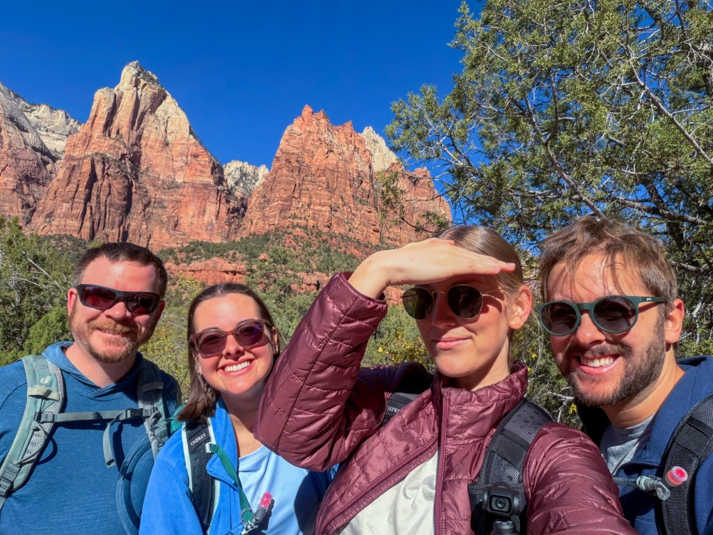 When we stopped at stop 4 on the shuttle map, Court of the Patriarchs, we spotted a helicopter with a rescuer dangling from a hoist! We weren’t sure if that was the same person that they were conducting the search and rescue for, but I snapped a view pictures because I was still playing with the zoom on my new iPhone 17 Pro Max (such a good upgrade that I panic bought before the trip lol) There was a short walk to a viewpoint there too, so of course we checked that out.
