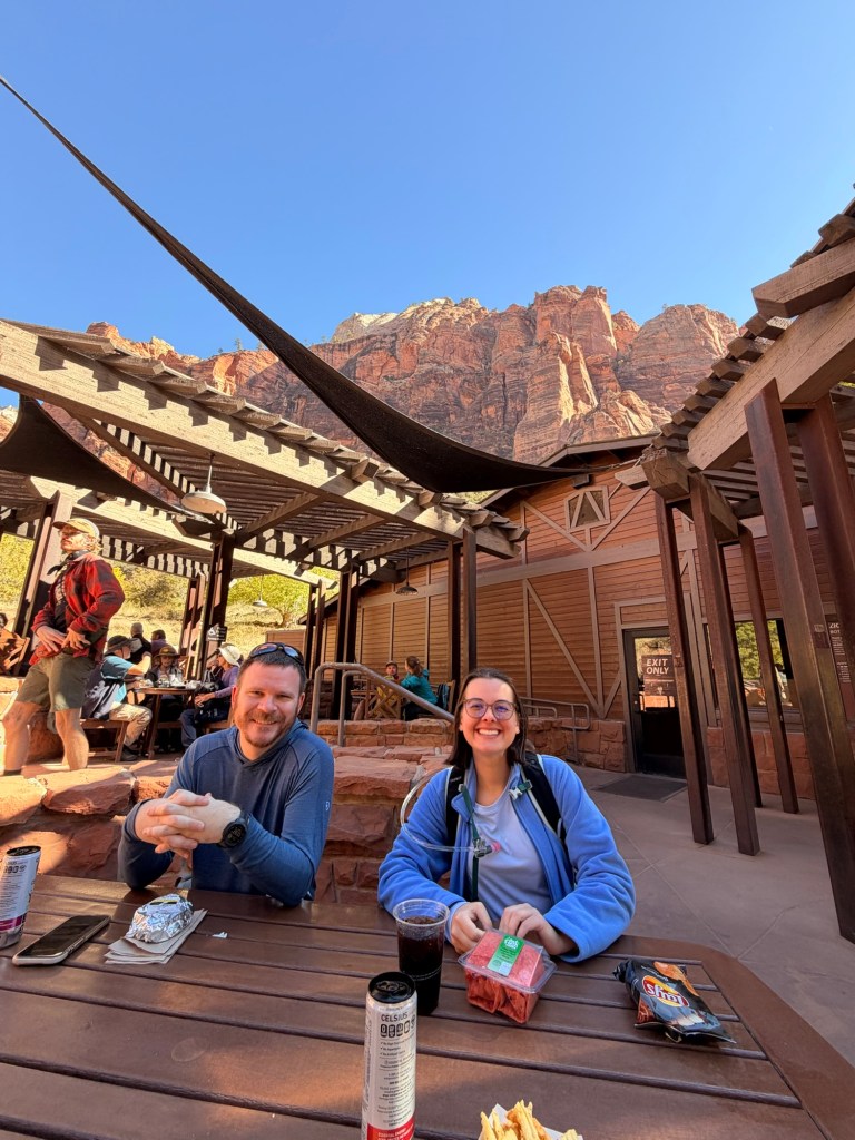 Next, we stopped at the Zion Lodge, which Jordan had tried to book for the night before Angels Landing, but it was fully reserved. Such a bummer because the grounds were gorgeous. The lodge sits tucked between towering canyon walls, overlooking a huge green lawn with a massive cottonwood tree, which might be the oldest in Utah according to our GuideAlong app. We grabbed burgers from the quick-service spot and they really hit the spot. It was such an incredible view for a casual lunch.