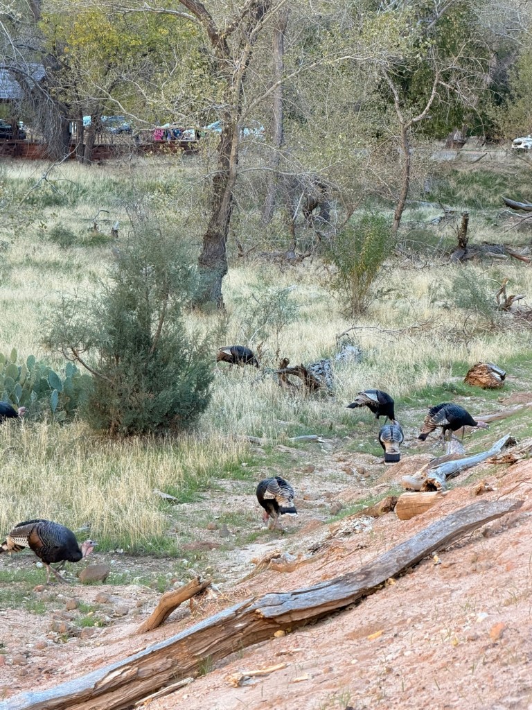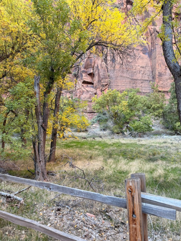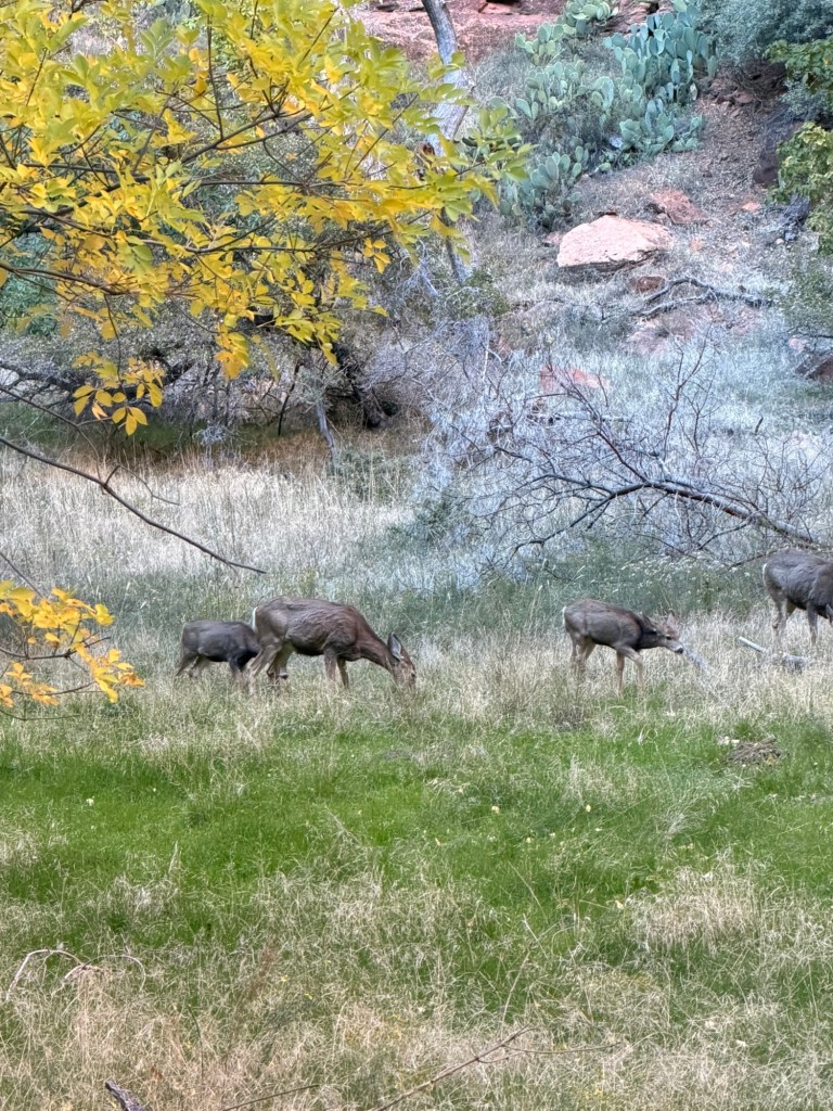 With that five-minute stop behind us, we headed to the Temple of Sinawava, which is the final shuttle stop unless you’re planning to hike the Narrows. We had that hike scheduled for Sunday, so we knew we’d be back. While we were there, we saw an incredible number of mule deer. On our ride back down, we kept seeing more and more, and according to shuttle driver Ron, he and the other drivers had been talking about how many there were that day! It was apparently an unprecedented number of sightings, which was pretty cool to find out later.