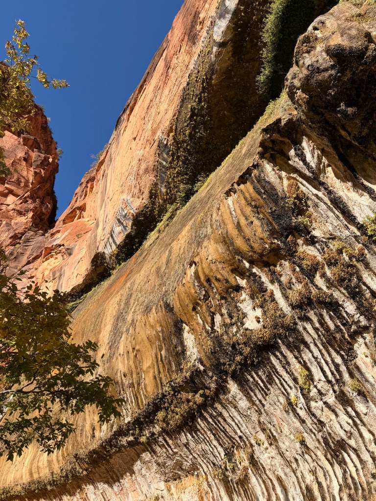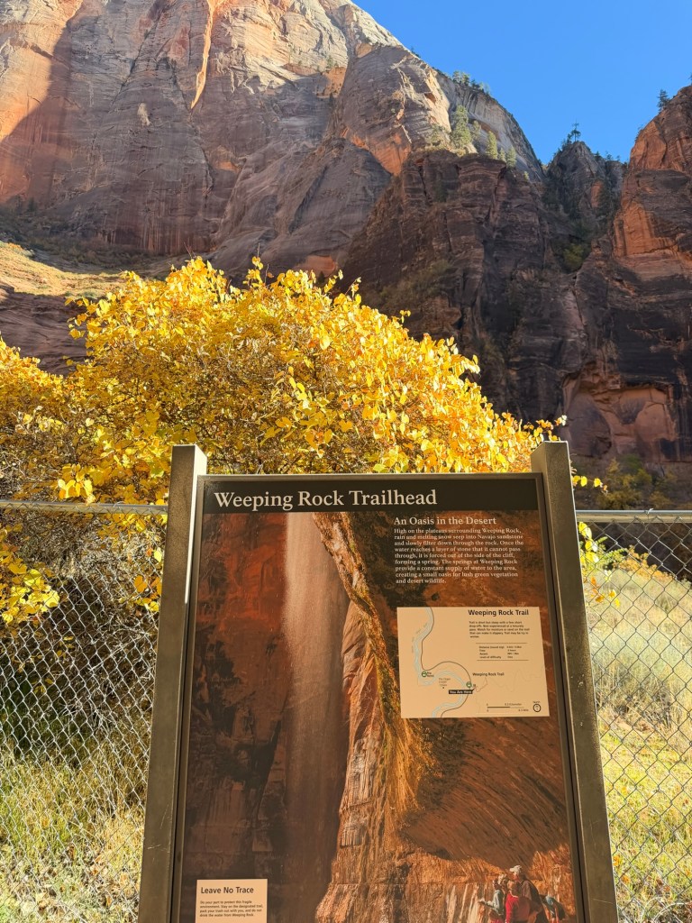 Next on our bike tour was Weeping Rock. This short trail had apparently been closed since 2023 due to a rockfall and had only recently reopened, so we were excited for the opportunity to check it out. It was a very short walk up a paved path that dead-ended at, quite literally, a weeping rock! At the time, we didn’t know much about what made it special, but we later learned some fascinating geological facts from our Angels Landing shuttle bus driver, Ron.