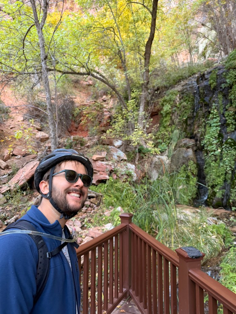 It was getting a little later in the day at that point, but we were still determined to make it to the end of the Zion Canyon Scenic Drive. We kept biking north and made a quick stop at what our bike rental agency called the “Secret Springs.” We had definitely hyped this one up in our heads a bit more than we should have. It turned out to be a very short offshoot from the road with a small deck and a little waterfall at the end. Still, it was funny since we’d spent all day making sure we didn’t forget to visit the Secret Springs so they wouldn’t be a secret anymore.