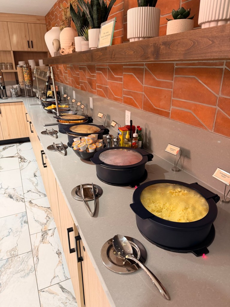 After ogling all the mountain views, we headed down for a quick bite to eat at the continental breakfast, which turned out to be a major highlight of the hotel. The menu changed daily! This morning was French toast sticks, eggs, sausage, and potatoes, and they had a fully stocked parfait bar as well. We couldn’t stop raving about it.