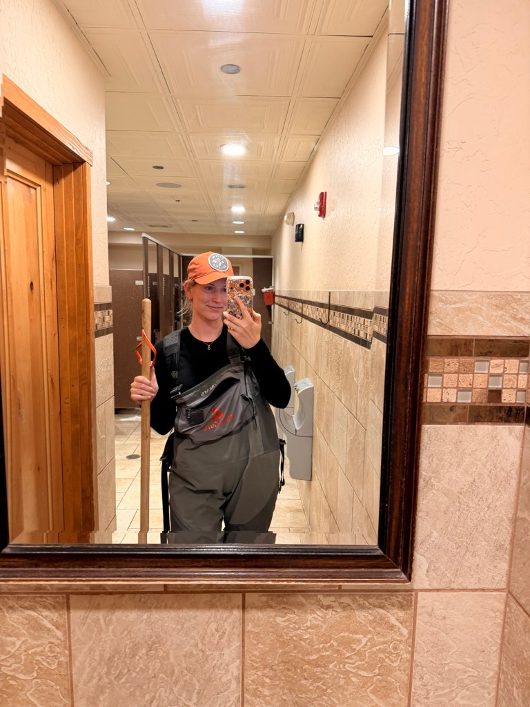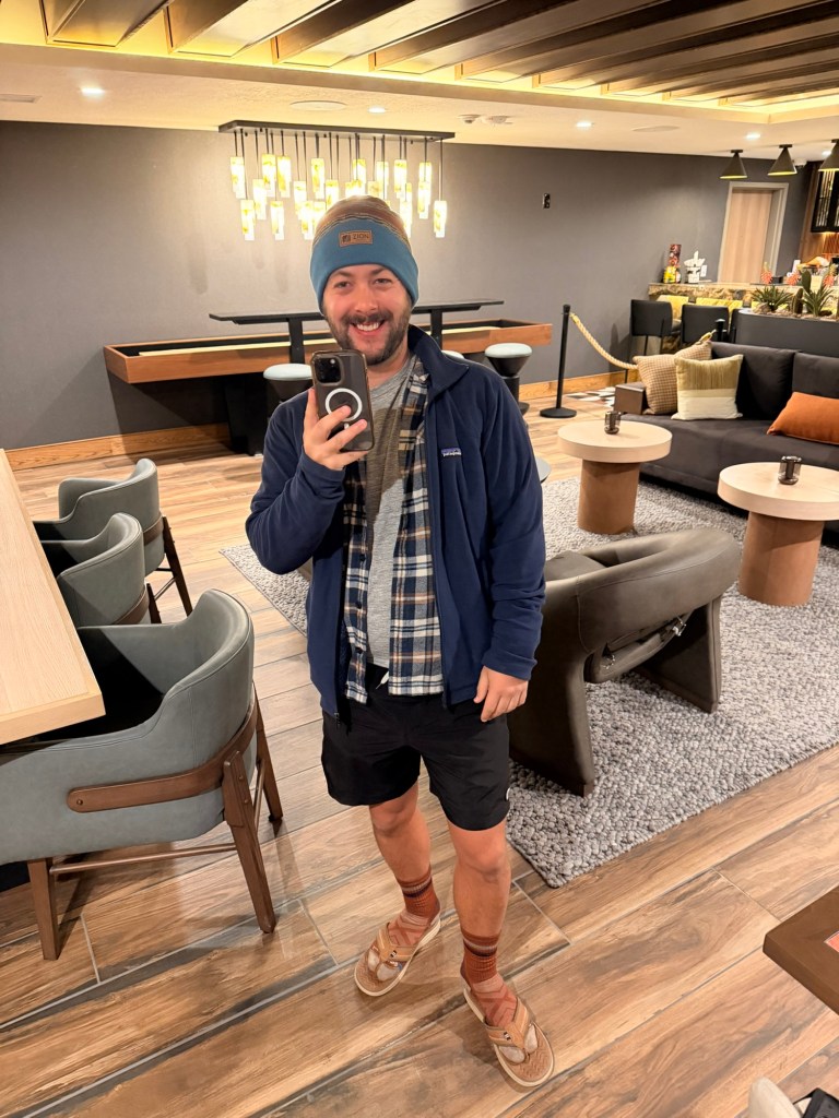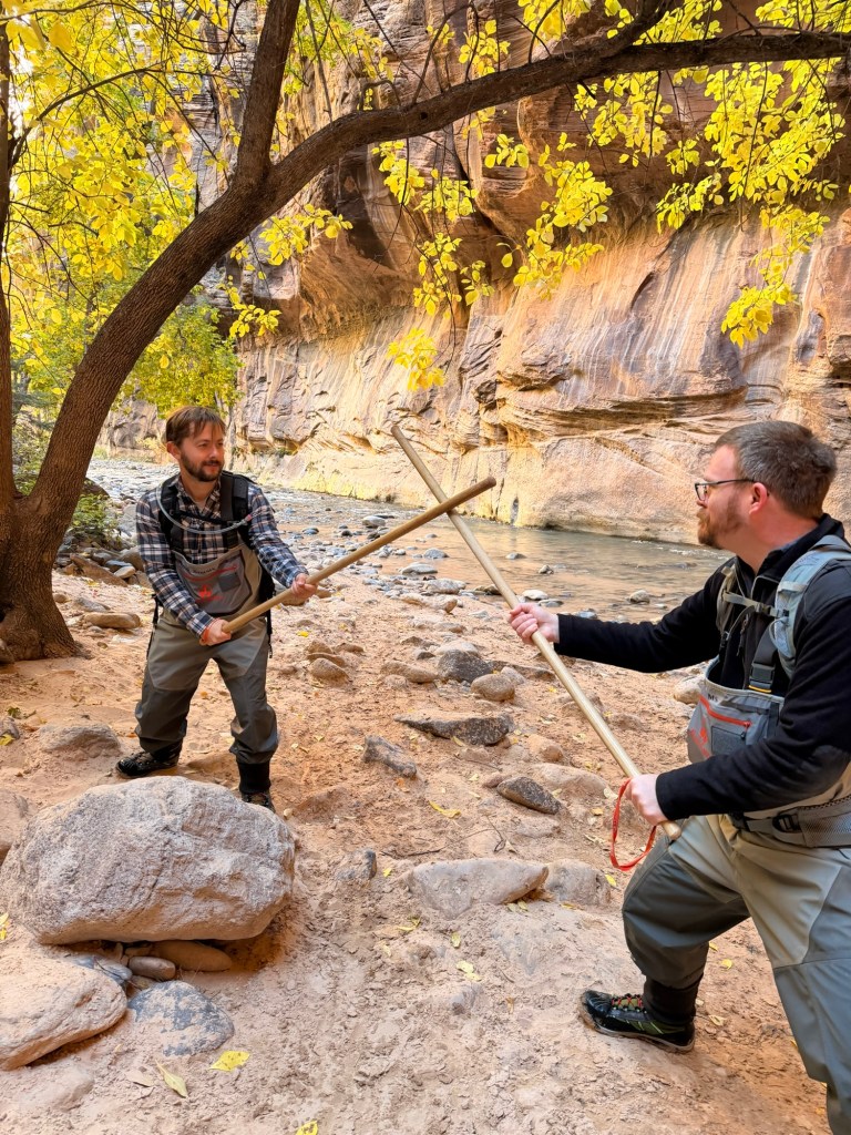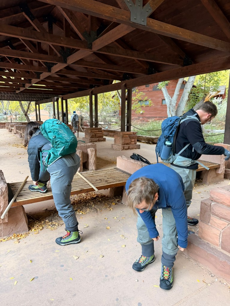 This was definitely another early morning. We headed down to breakfast around 6:30 a.m., bundled in a very questionable assortment of layers. Normally, dry bibs have separate sock and suit pieces, but we opted for Zion Guru’s version where the neoprene sock and bib are all one piece, which is key for keeping your feet dry. Until we reached the trailhead, though, we wandered around in our base layers with a plan to suit up later.