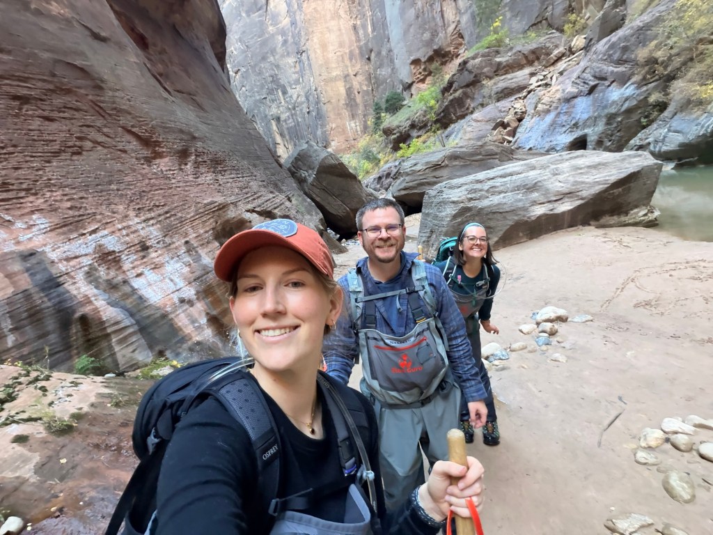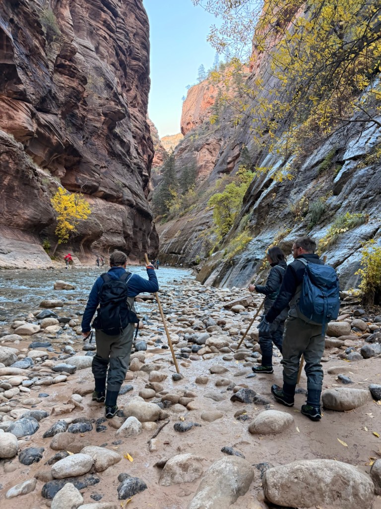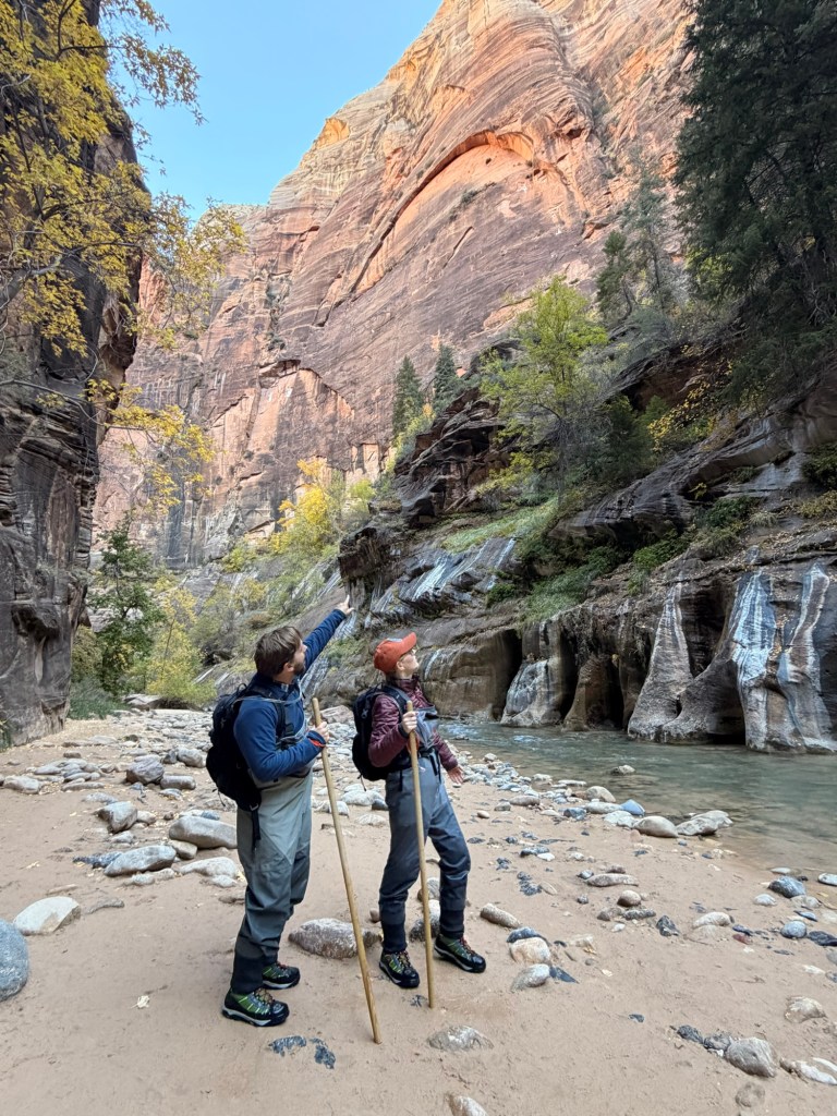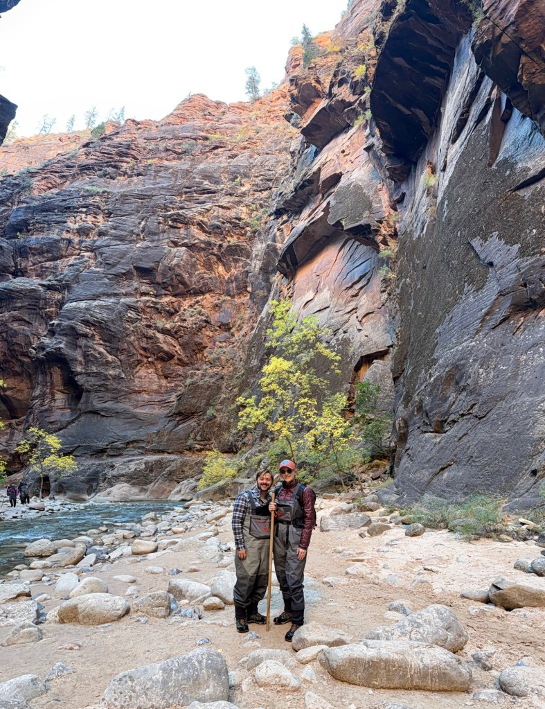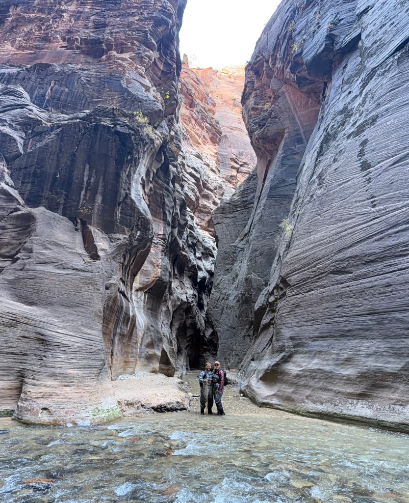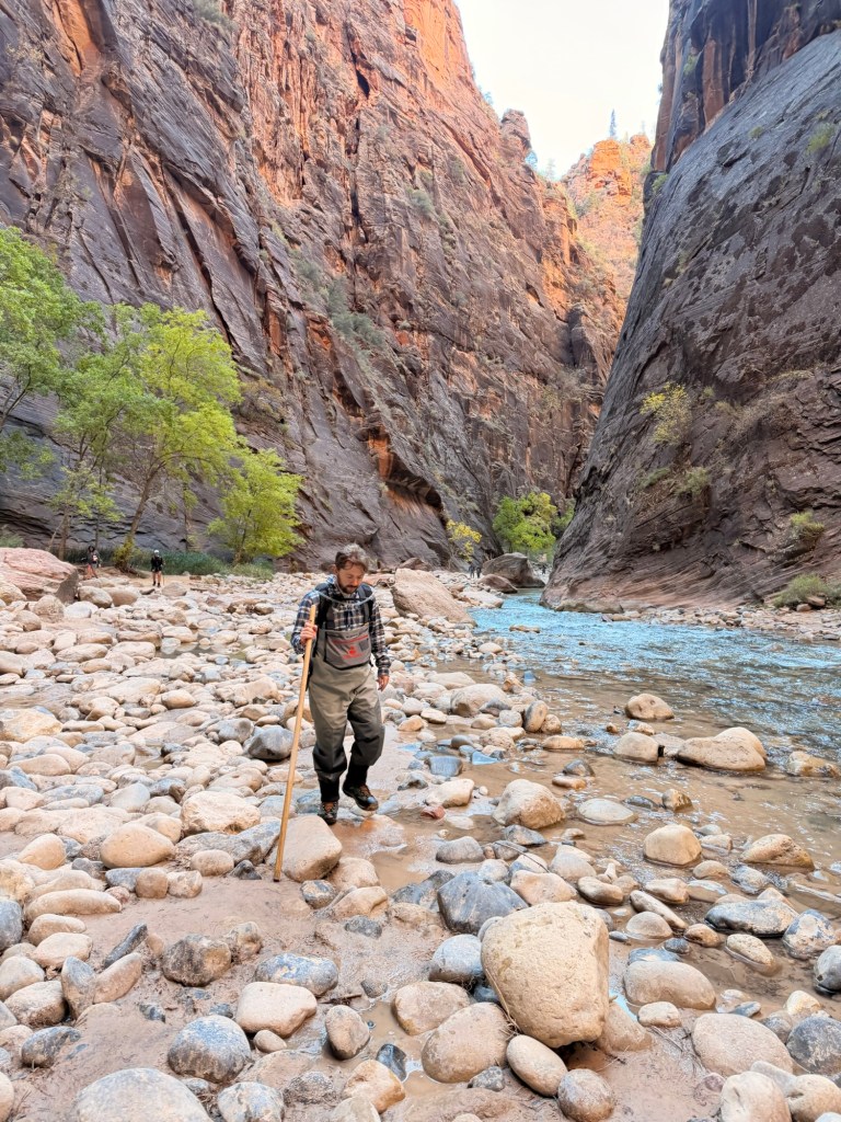 After breakfast, we hopped on the bus and headed toward the Temple of Sinawava. By about 8:00 a.m., we were finally gearing up, snapping the obligatory “before” photos, and officially starting our Narrows adventure. To reach the river, you first descend the one-mile Riverside Walk, a paved trail that follows the river until you get to the entry point. We were eager to get started and moved pretty quickly.
