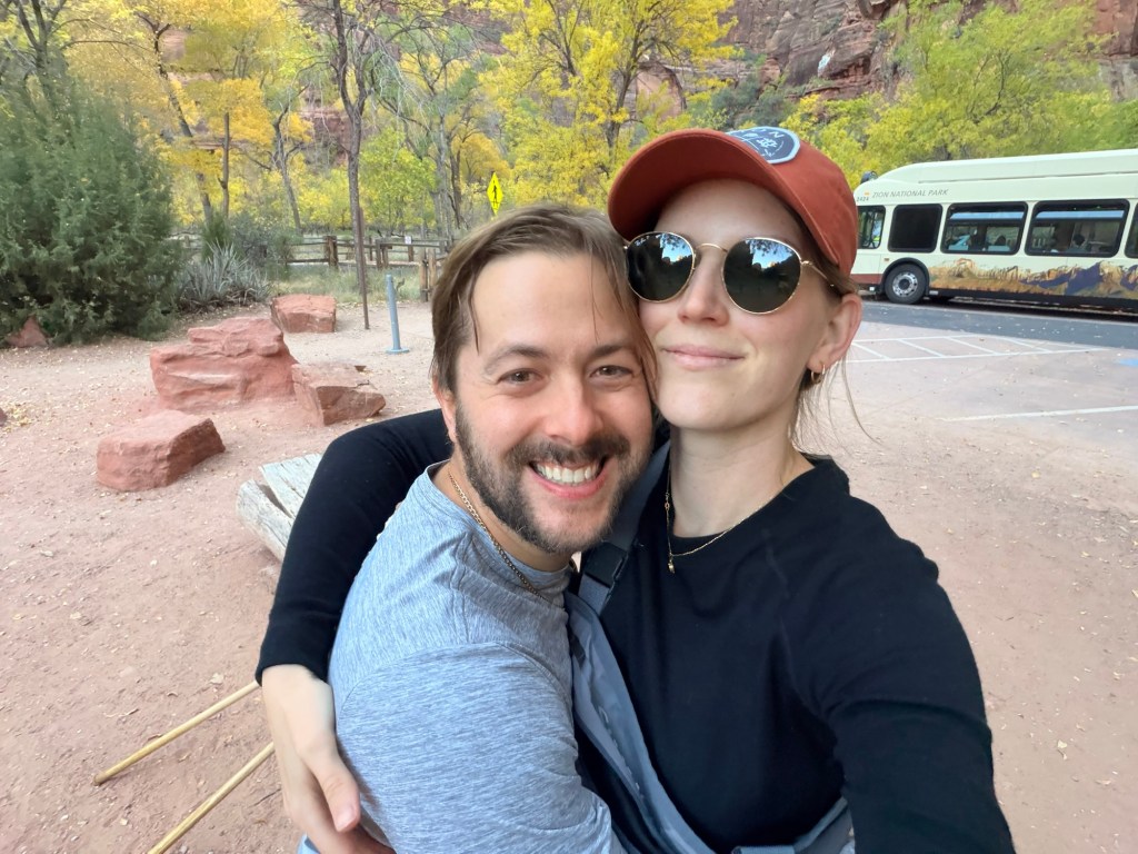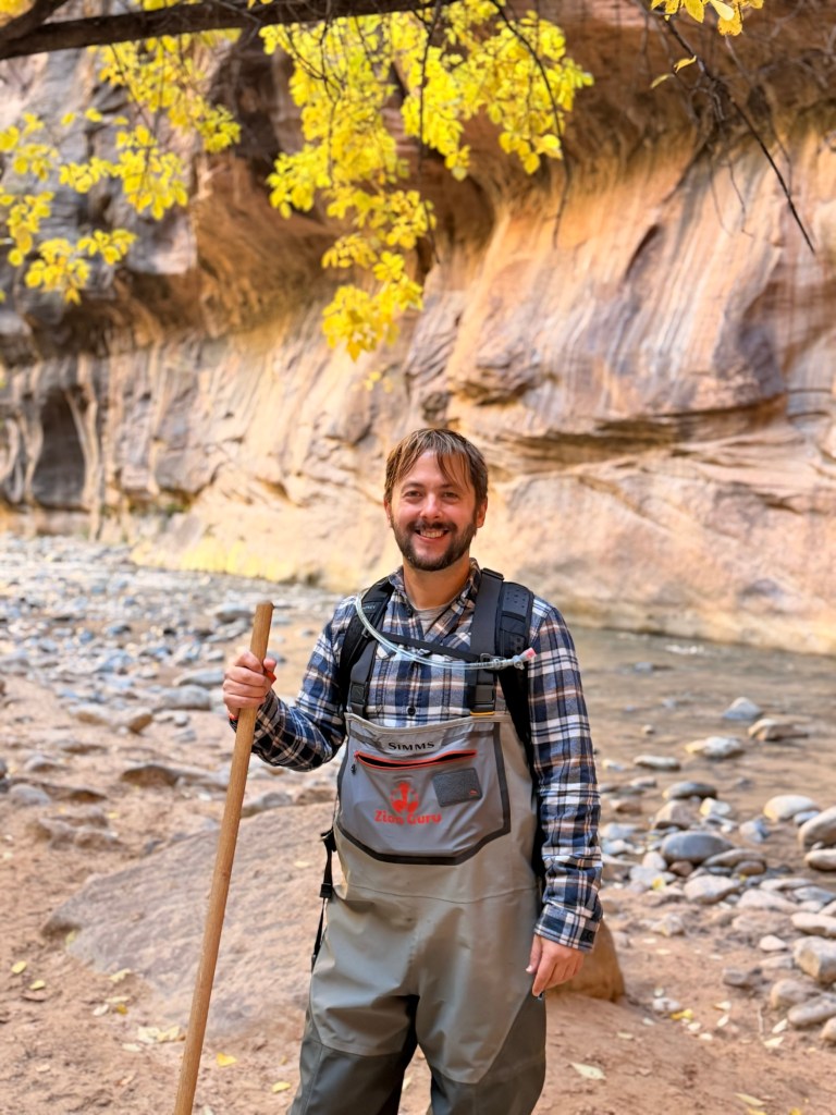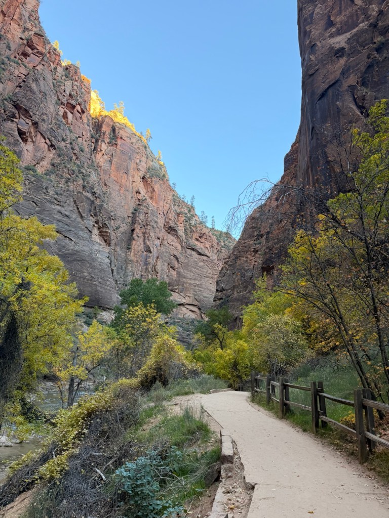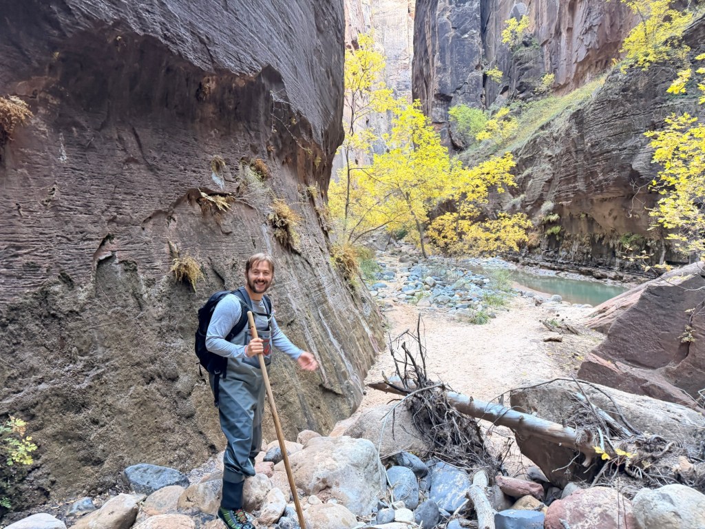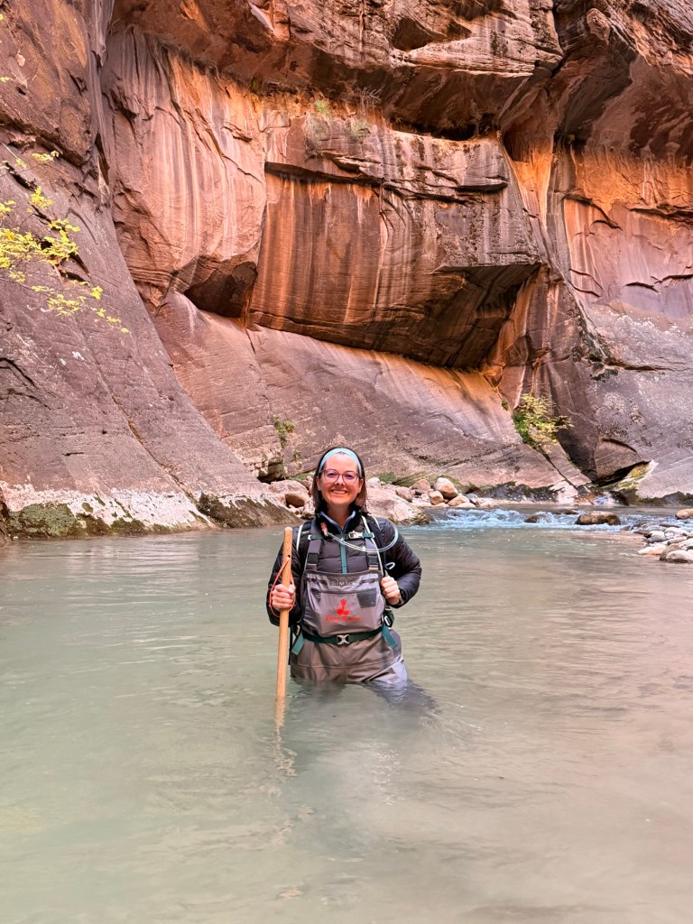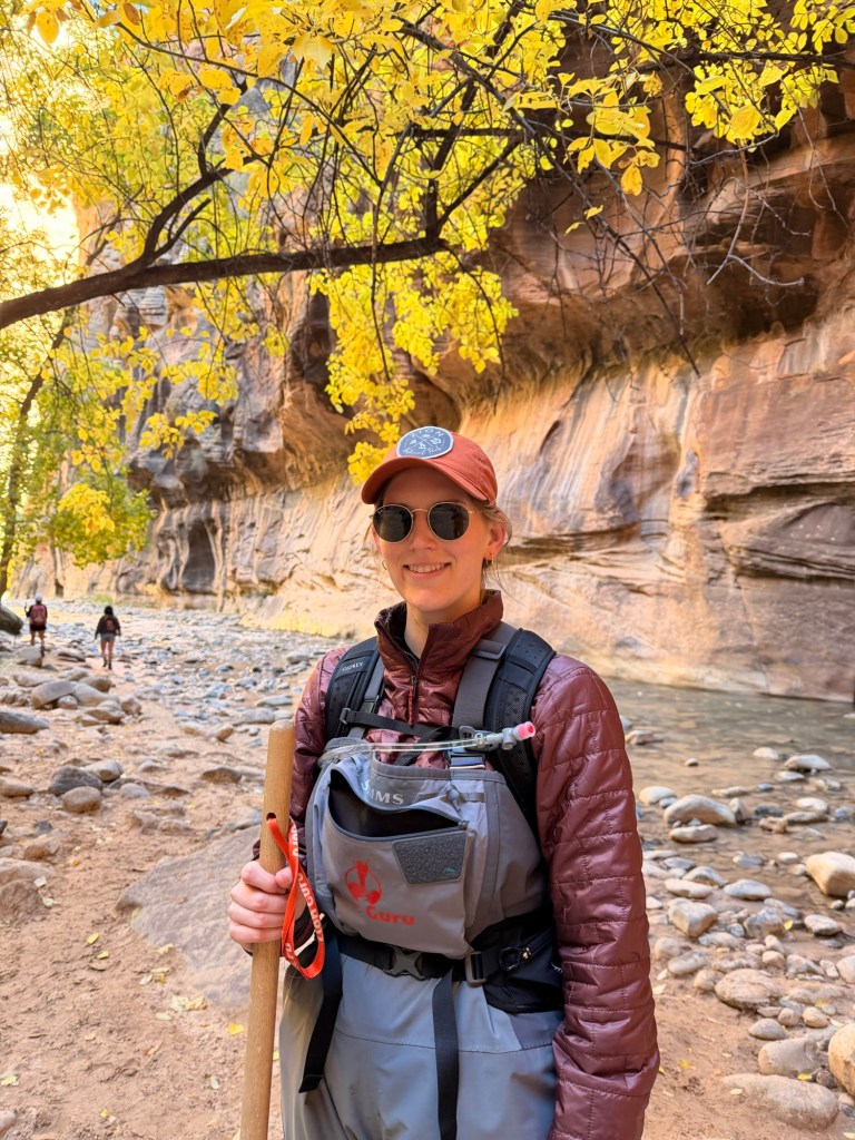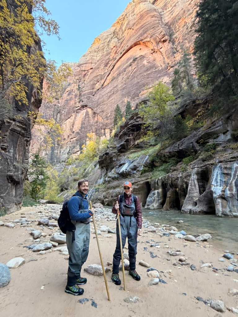 After breakfast, we hopped on the bus and headed toward the Temple of Sinawava. By about 8:00 a.m., we were finally gearing up, snapping the obligatory “before” photos, and officially starting our Narrows adventure. To reach the river, you first descend the one-mile Riverside Walk, a paved trail that follows the river until you get to the entry point. We were eager to get started and moved pretty quickly.