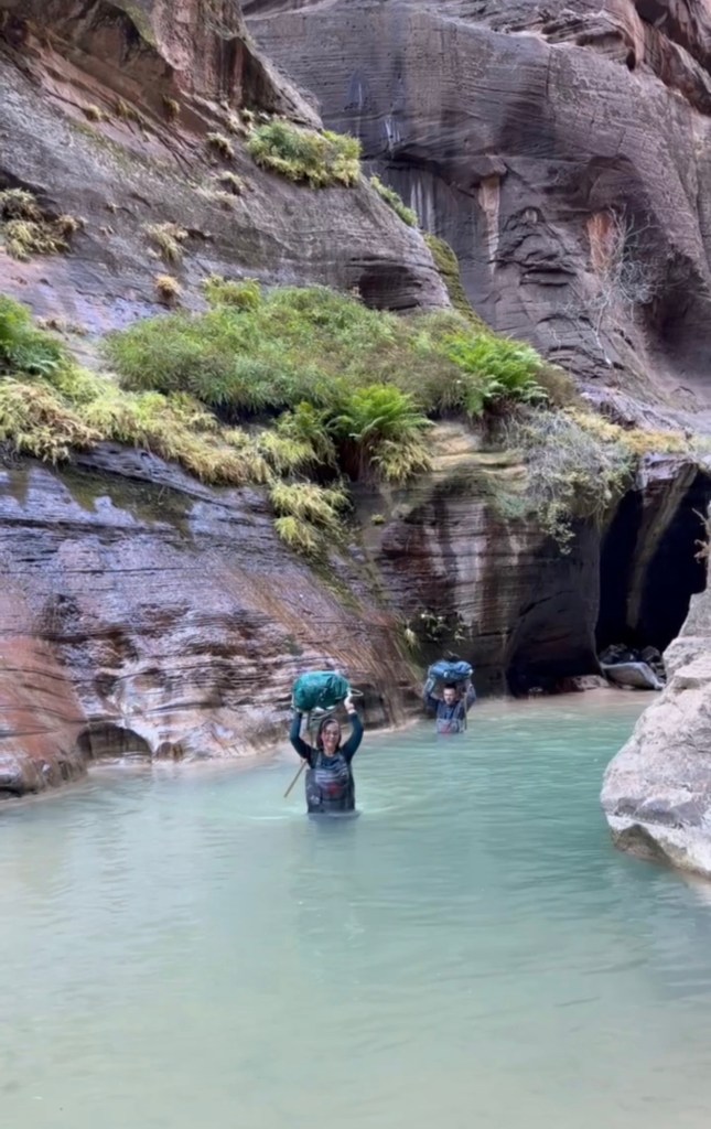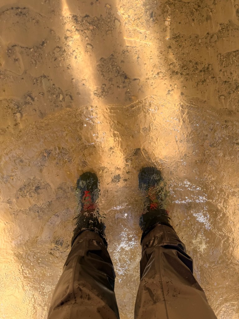 We soon reached a section where crossing did not help at all. The water was deep no matter what. We took our packs off and carried them overhead while wading through. The bibs held up, but since they were not full waders, we were very aware of not letting the water rise too high. Luckily, no one got soaked, though the force of the water pressing the bibs against your body was wild to feel.