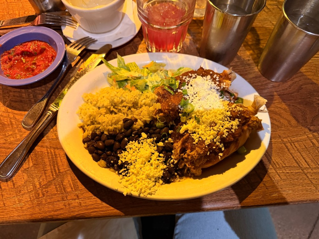 We ordered jalapeño poppers, chips, and salsa, and somehow kept eating despite already having had “burger appetizers.” Caroline and I ordered the sweet potato pork tamales, and honestly, we should have split between the two of us because we ended up with a lot of leftovers. Everything was delicious though.