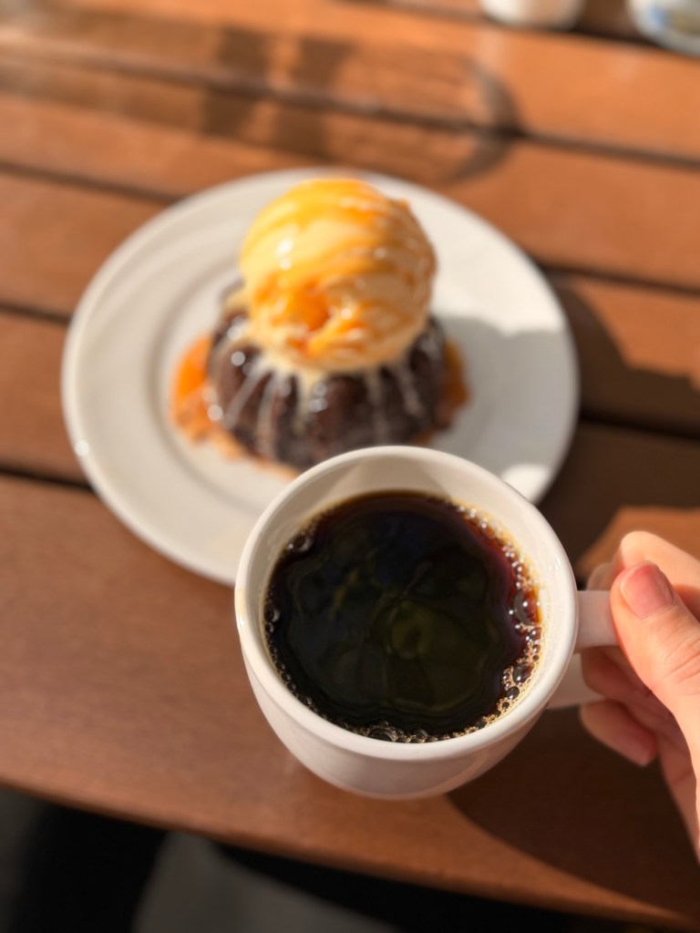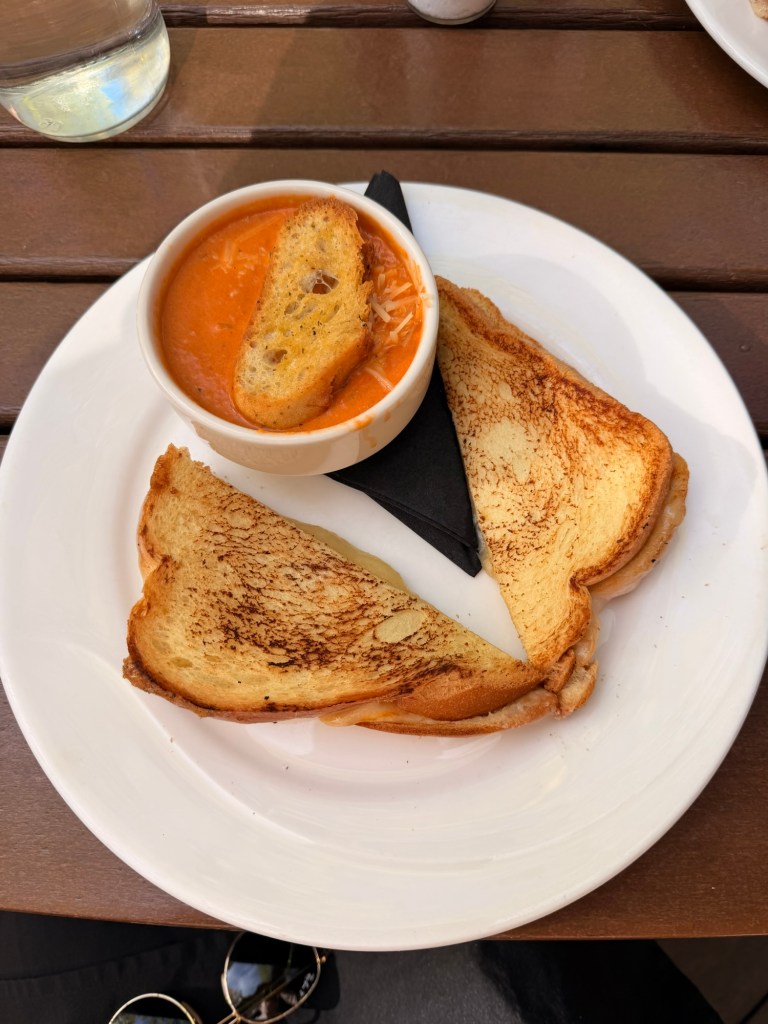 We all ordered grilled cheese with tomato soup, and it absolutely hit the spot. For dessert, I went with the chocolate cake topped with ice cream and a cup of coffee, which was the perfect pairing.