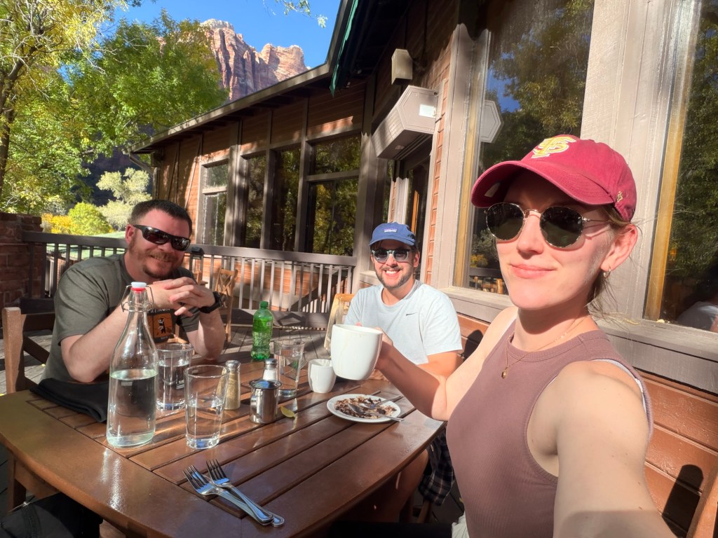 From there, we rode the park bus to stop 8 at Big Bend, the same stop where we saw California condors for the first time during our 2021 trip. Even though we did not spot any condors this time, the views were still incredible. It felt sad knowing this was likely our last look at the canyon for a while. We walked down a short trail toward the river, where Tyson took a small spill but somehow managed to keep his Mountain Dew upright, which honestly felt like an achievement.