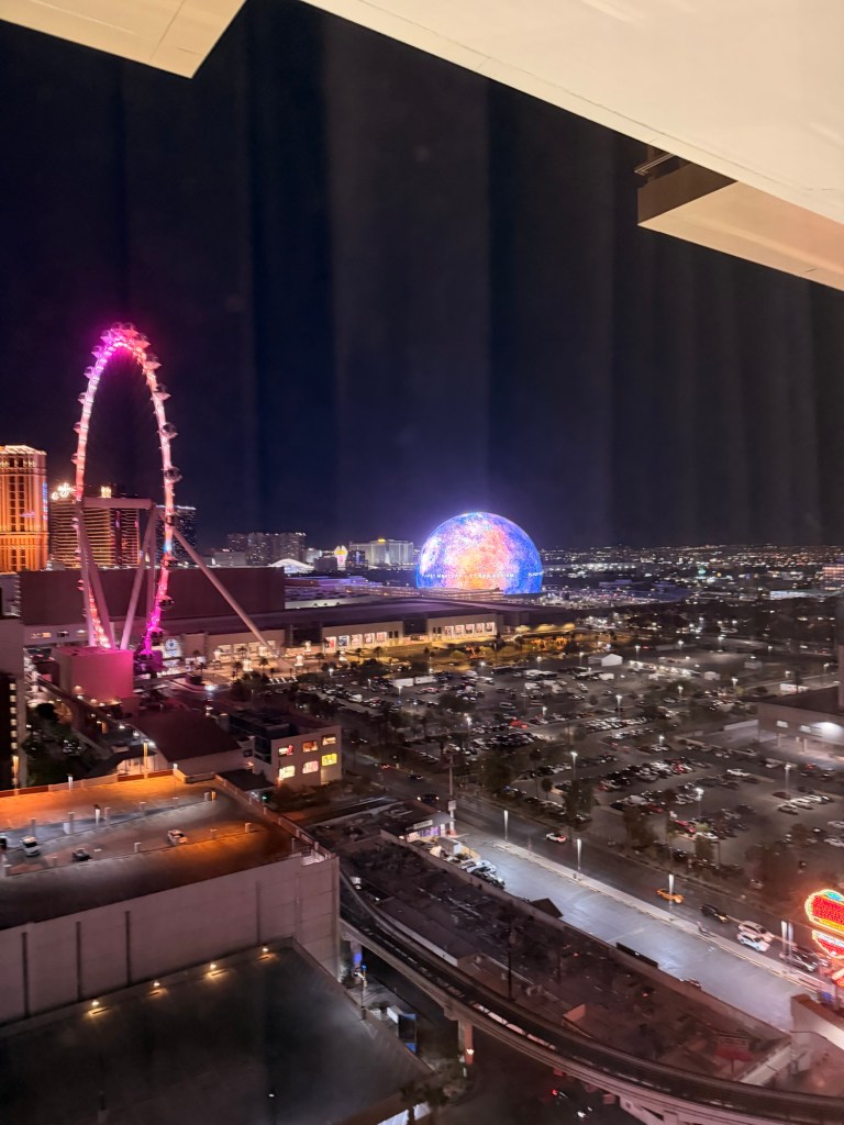 We had a 7:00 p.m. reservation at a Thai restaurant Caroline had found that came highly recommended, so once we arrived at the hotel, we had about fifteen minutes to get ready. What little we saw of the room looked nice. The Horseshoe is an older hotel, but it worked perfectly for a one-night stay, and the view of the Sphere was a fun bonus.