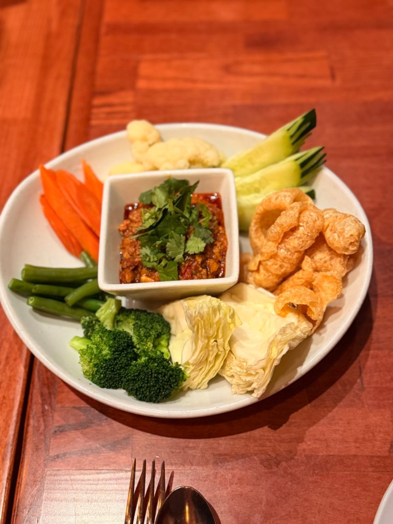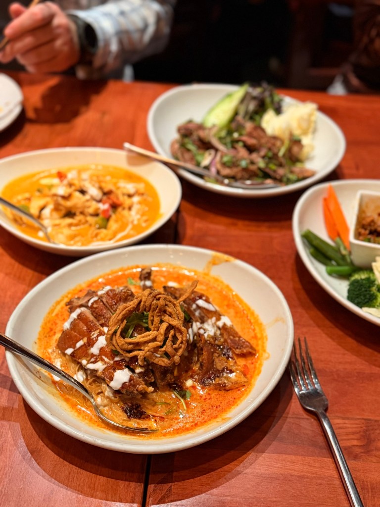 I am so glad Caroline found Lotus of Siam because the menu was incredible. No one wanted to be stuck with just one dish, so we ended up ordering a few dishes to share family style. We shared the Nau Prik Ong (ground pork, served with vegetables and pork rinds), garlic prawns, Nua Nom Tok (sliced steak with green onions, red onions, mint, cilantro, and dried chilies), Khao Soi Crispy Duck, and panang curry.