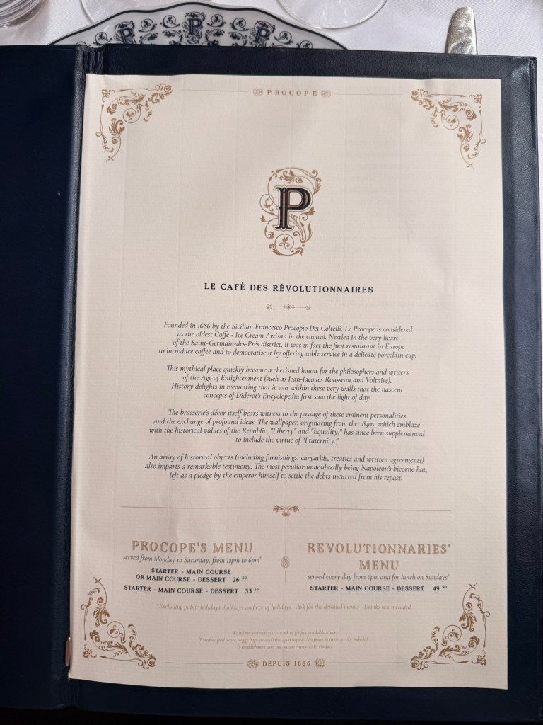After the bookstore, we headed back to the hotel to wait for our 3 PM lunch reservation at Le Procope. This is one of the most famous restaurants in Paris, founded in 1686, and is supposedly the first place to introduce coffee to Paris!